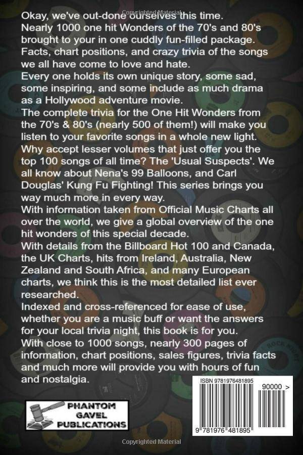 This series brings you way much more in every way. With information taken from Official Music Charts all over the world, we give a global overview of the one hit wonders of this special decade. With details from the Billboard Hot 100 and Canada, the UK Charts, hits from Ireland, Australia, New Zealand and South Africa, and many European charts, we think this is the most detailed list ever researched. Indexed and cross-referenced for ease of use, whether you are a music buff or just want the answers for your local trivia night, this book is for you.