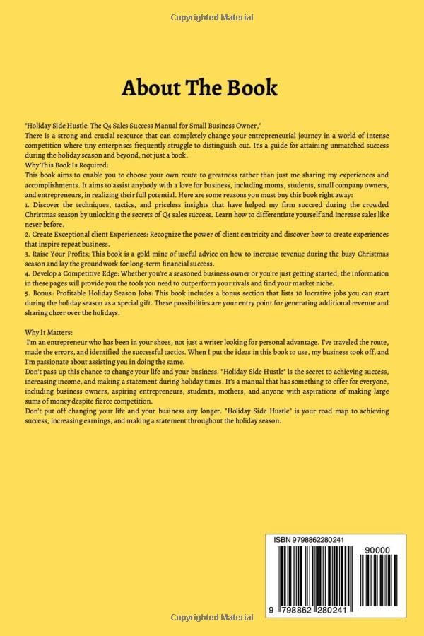 Don't pass up this chance to change your life and your business. "Holiday Hustle" is the secret to achieving success, increasing income, and making a statement during holiday times. It's a manual that has something to offer for everyone, including business owners, aspiring entrepreneurs, students, mothers, and anyone with aspirations of making large sums of money despite fierce competition.