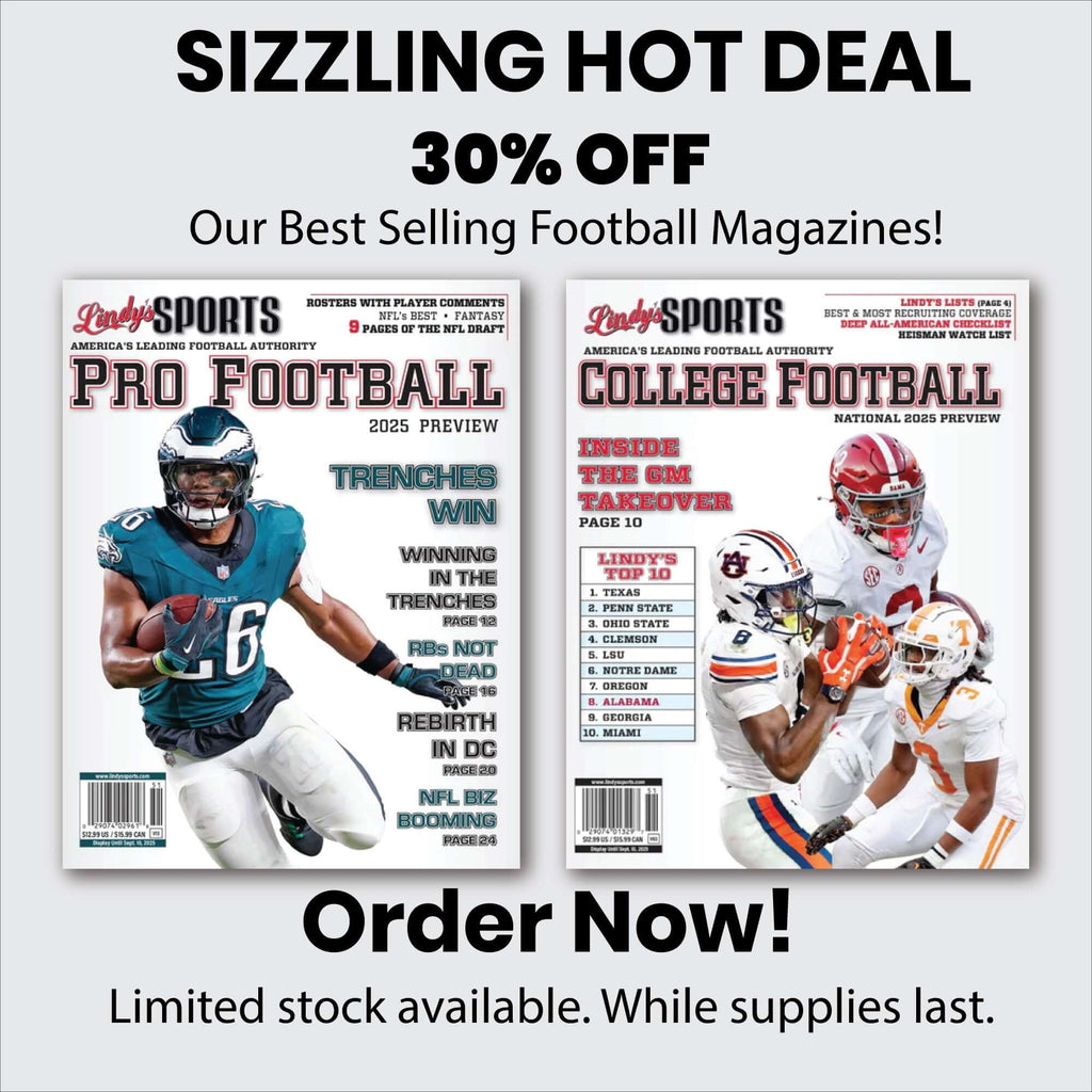 Lindy's 2025 Pro Football Magazine contains rosters, schedules and team/player information. It's rounded out with great feature stories, action photos, individual and team stats for NFC and AFC, draft analysis, rating the teams and lots more. Order your copy today!!