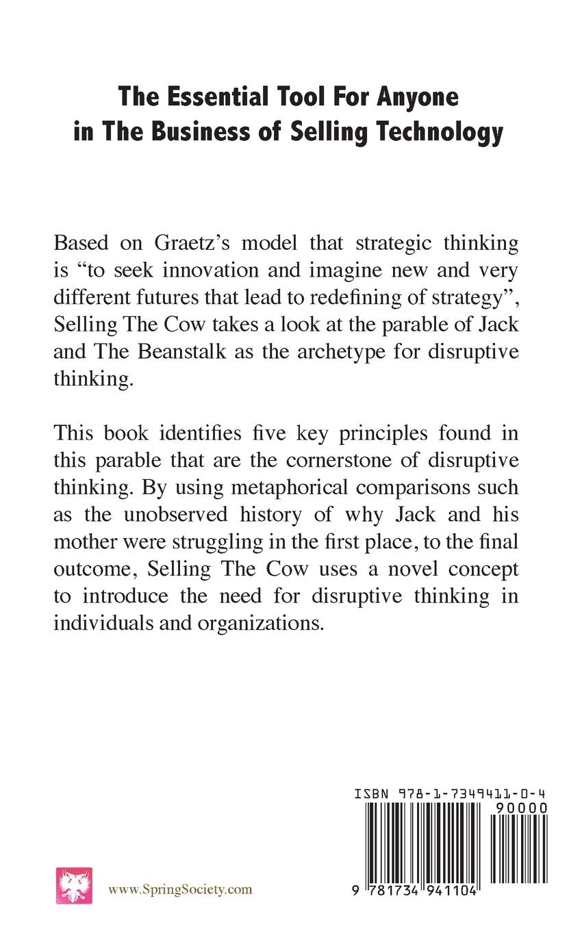 Based on Graetz's model that strategic thinking is "to seek innovation and imagine new and very different futures that lead to redefining of strategy", Selling The Cow takes a look at the parable of Jack and The Beanstalk as the archetype for disruptive thinking. This book identifies five key principles found within this parable that are the cornerstone of disruptive thinking. By using metaphorical comparisons such as the unobserved history of why Jack and his mother were struggling in the first place, to the final outcome, Selling The Cow uses a novel concept to introduce the need for disruptive thinking in individuals and organizations.