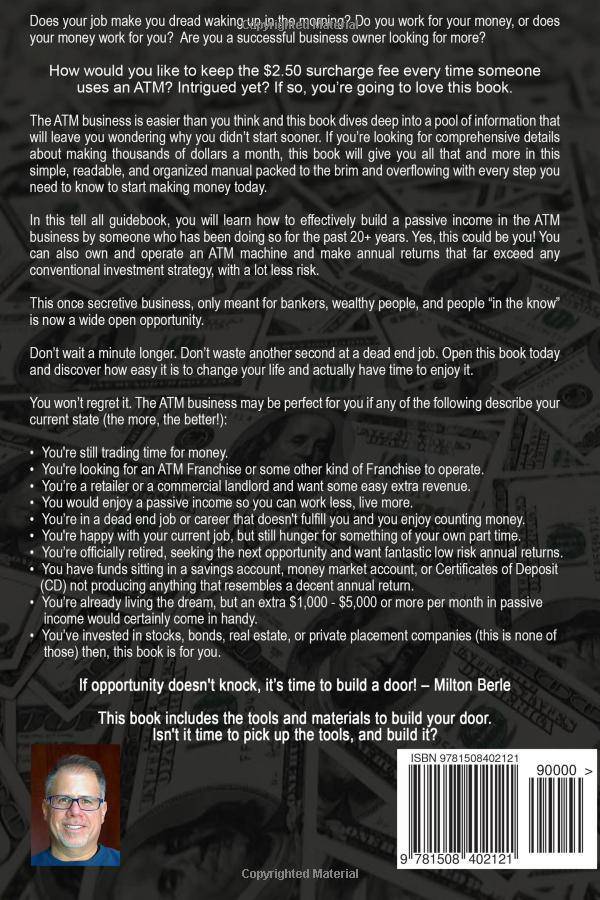 How would you like to keep the $2.50 Surcharge fee Every Time Someone uses an ATM? In this book I'm going to teach you how to build a passive income in the ATM Business. I've been doing it for the past 20+ years and it has afforded me the opportunity to live in Southern California, work a block from the beach, and live the dream. It's given me the freedom to choose the hours I work, even if I want a 4 hour work week. Stop trading time for money - you can work less, live more. This book explains why people pay upwards of $3.00 every time they use a non-bank ATM and how YOU CAN EARN THAT ENTIRE FEE to build wealth and earn a passive income from just a FEW HUNDRED DOLLARS a month to TENS OF THOUSANDS! Have you ever used an ATM Machine that wasn't part of your bank and had to press the key to say "YES - I agree to pay the Surcharge Fee"? How would you like to be the one collecting that fee - every time the ATM gets used?