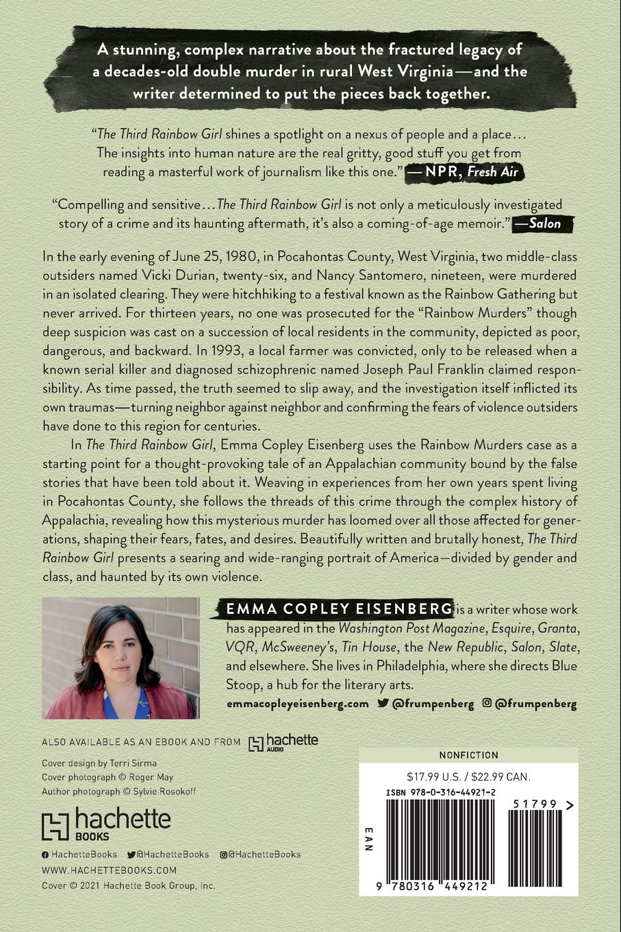 Weaving in experiences from her own years spent living in Pocahontas County, she follows the threads of this crime through the complex history of Appalachia, revealing how this mysterious murder has loomed over all those affected for generations, shaping their fears, fates, and desires. Beautifully written and brutally honest, The Third Rainbow Girl presents a searing and wide-ranging portrait of America—divided by gender and class, and haunted by its own violence.